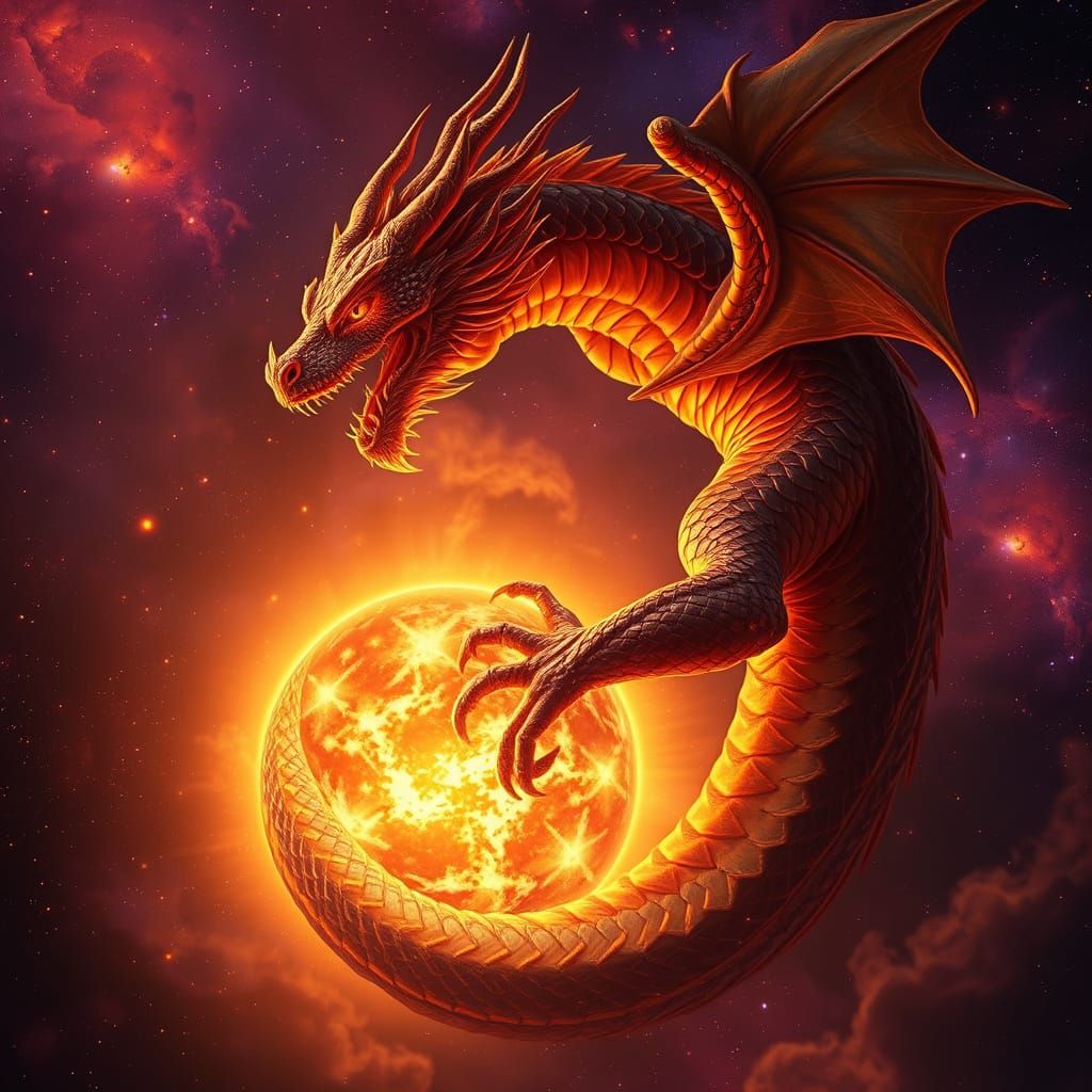 A digital painting of a celestial dragon embracing a star in its death throes. The dragon features scales of warm, fiery colors set against cosmic dust in a dark fantasy aesthetic.