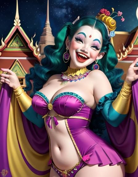 This image shows a low-angle glamour shot of a cheerful clown lady laughing at night. The image is a detailed matte painting with intricate details in a colorful, fantastical Thai art style.