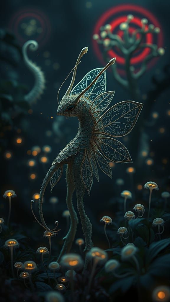 This image shows a delicate, filigree-adorned creature set amidst a dark, mystical botanical landscape, surrounded by glowing insects and a radiant tree, with a vibrant scarlet halo in the background, captured in stunning photorealistic detail.