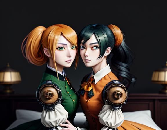 A manga-style illustration of identical twin kemono sisters in steampunk school uniforms. The image shows the sisters sitting on a bed, kissing, in orange and green hues with soft, dynamic lighting.
