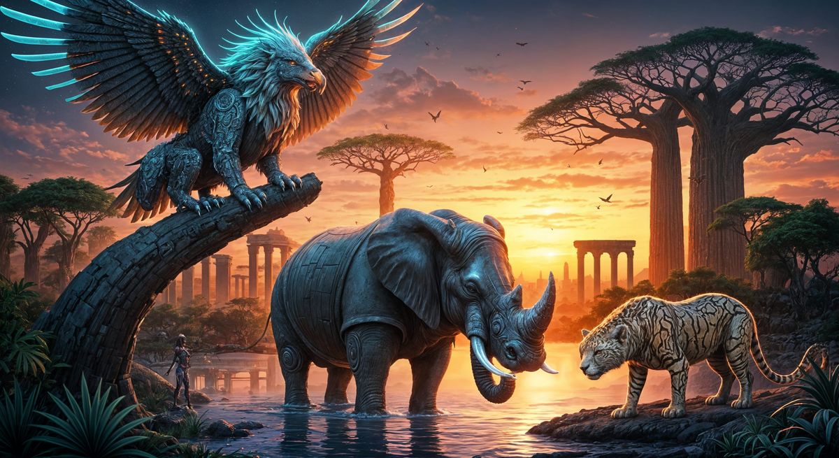 This image depicts a futuristic African cityscape at sunset, teeming with hyper-detailed cybernetic hybrid animals. Majestic creatures, such as lion-eagle and elephant-rhinoceros fusions, roam amidst neon-lit landscapes and holographic billboards, showcasing a blend of organic and synthetic elements.