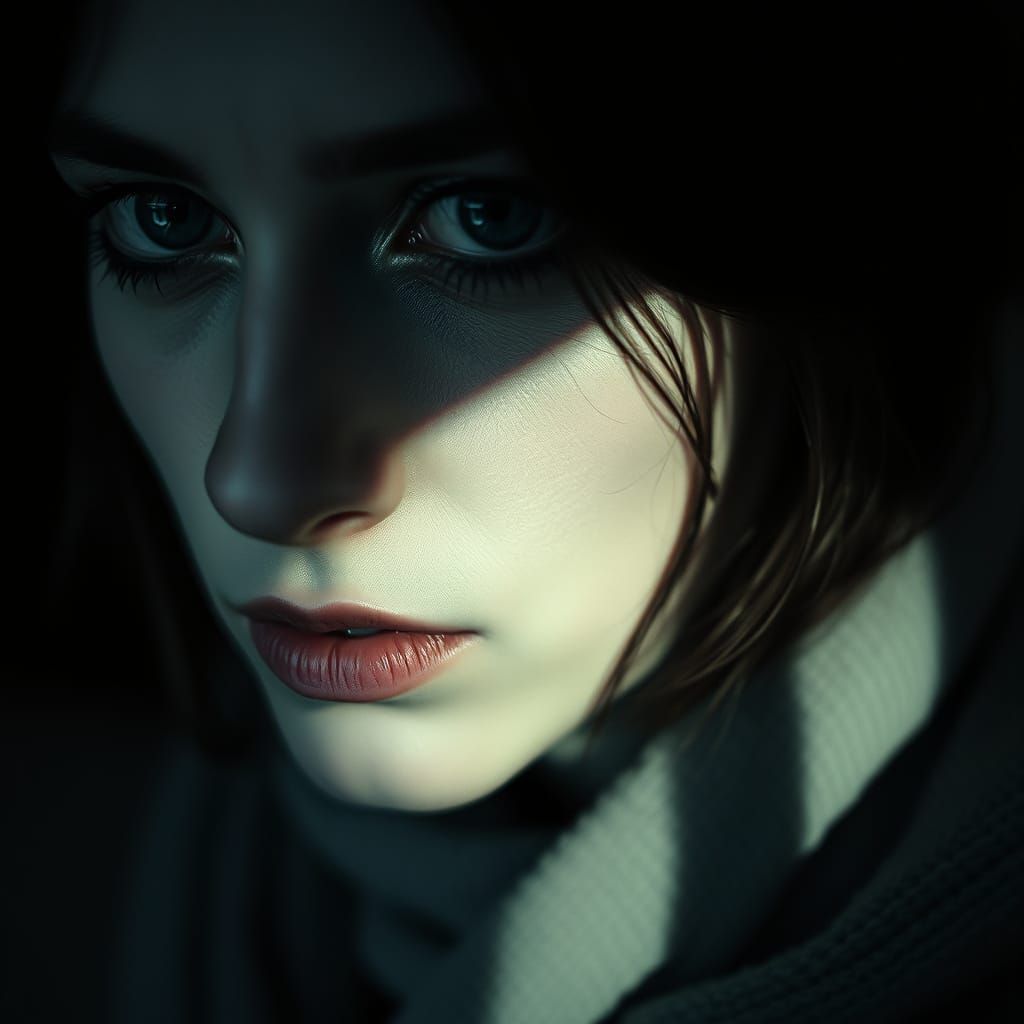 A close-up black and white portrait of a woman in the style of film noir. Soft, ambient lighting, heavy film grain and dramatic color grading enhance the image's emotive atmosphere.