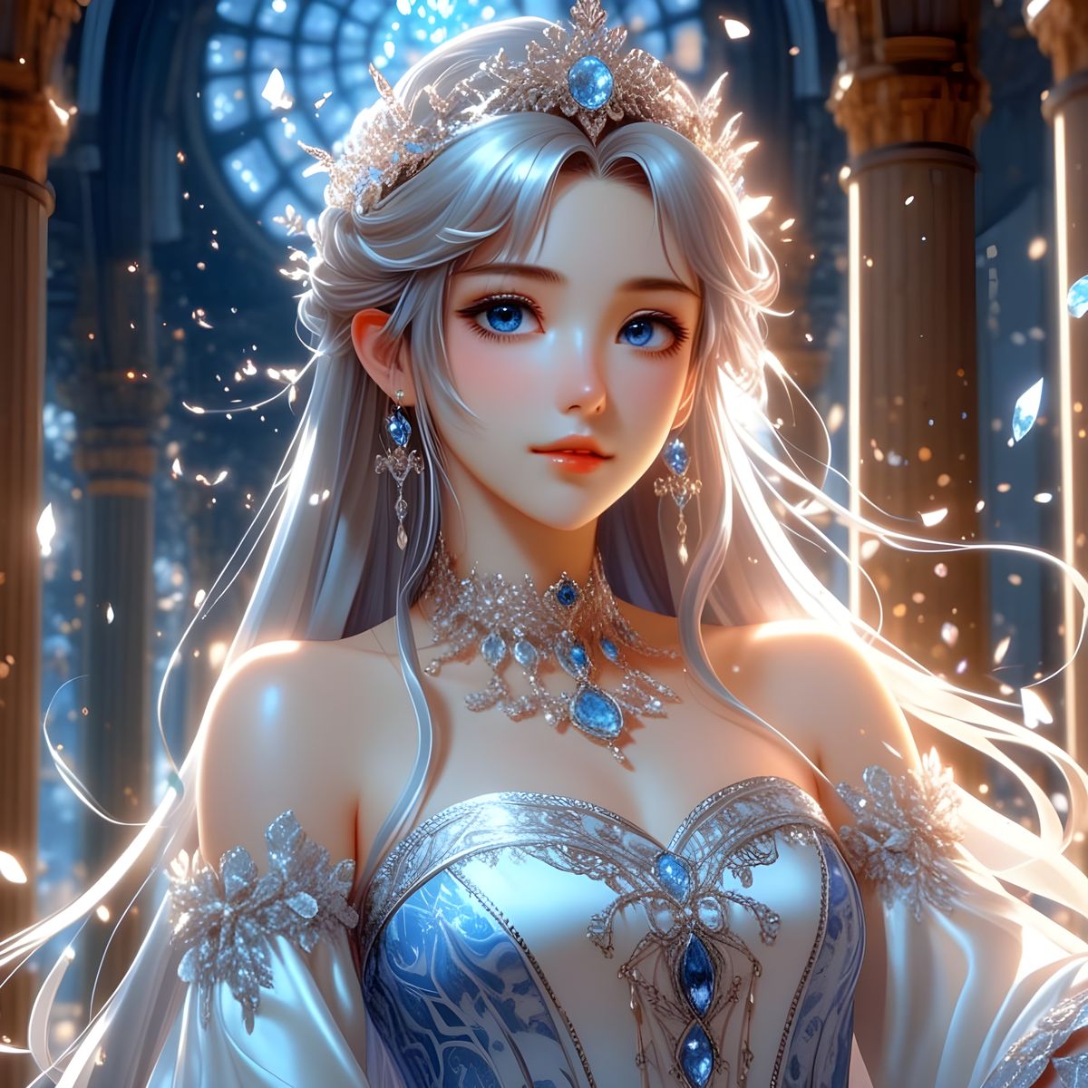 This stunning anime-style portrait depicts Crown Princess Rosie as a divine goddess, exuding royal grace and ethereal beauty. Her silver hair shimmers with a soft glow, and her crystal blue eyes radiate serenity and wisdom. She wears a stunning silk dress with intricate patterns and a gentle shimmer, ado...