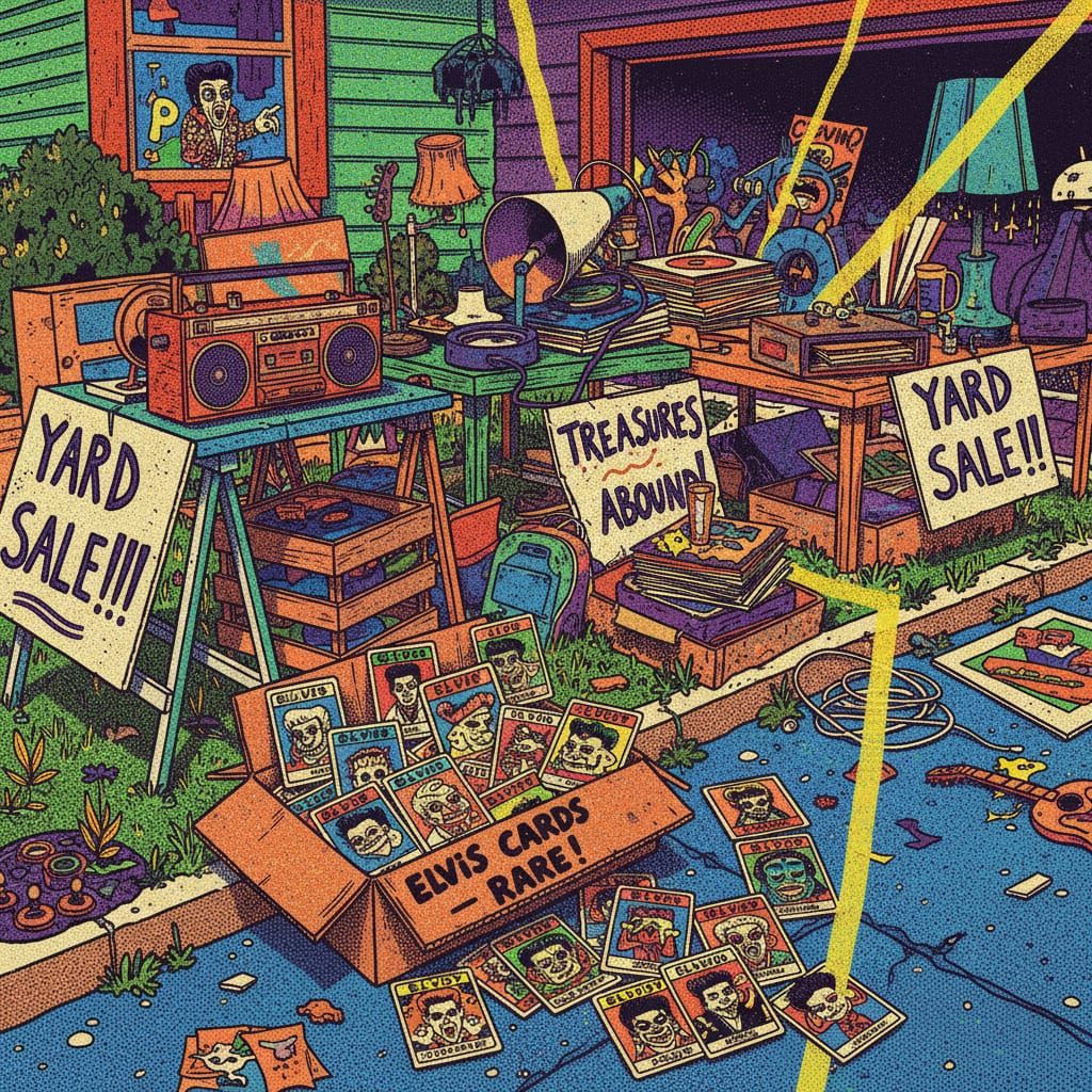 This image shows a messy garage sale scene with vintage items. The focus is a shoebox overflowing with rare Elvis Presley trading cards in a grotesque, exaggerated risograph style.