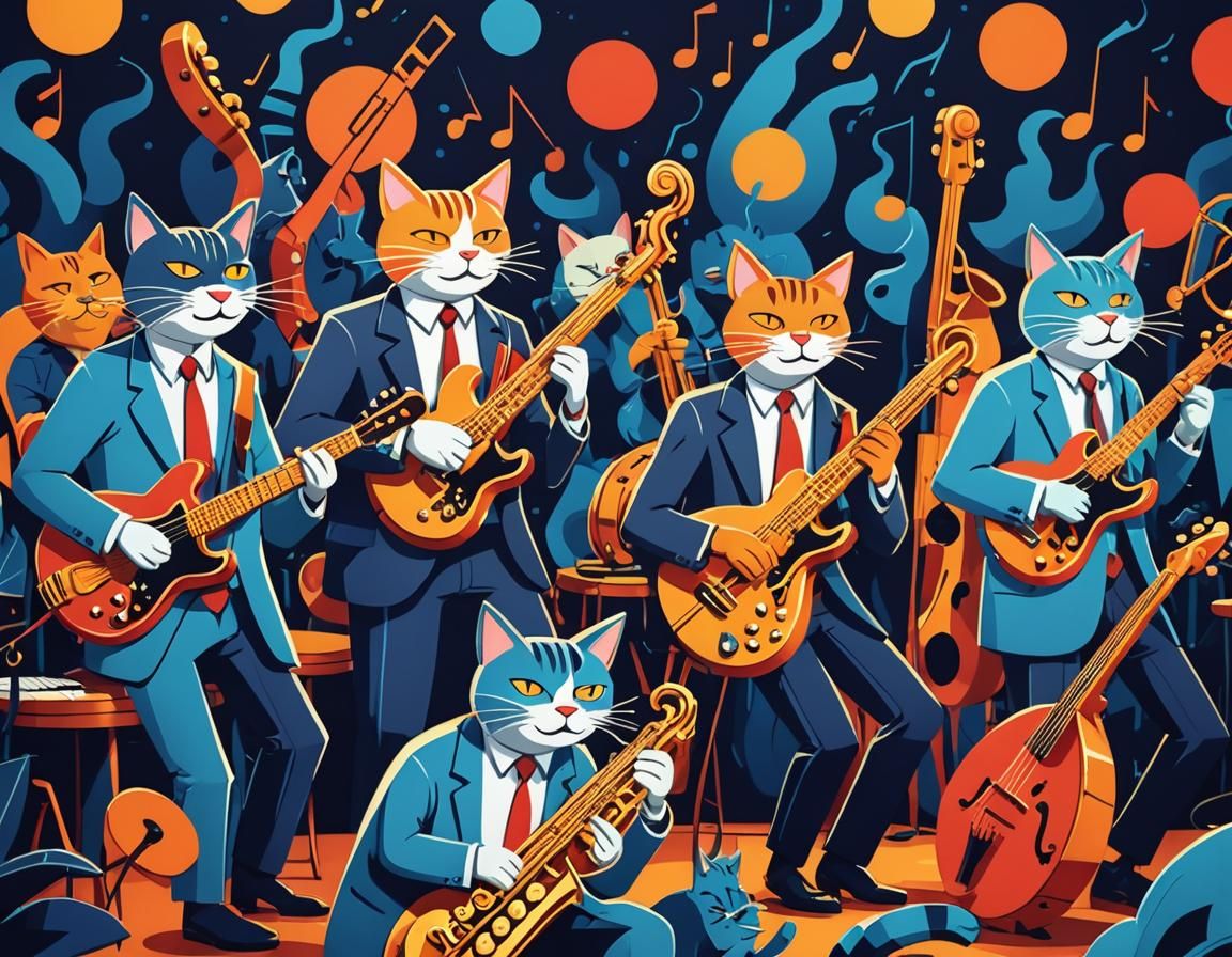 A vibrant cartoon illustration of cool cats in a jazz band. The mid-shot image features exaggerated cartoon styling and funky lines, with bright, music-inspired colors and warm stage lighting.