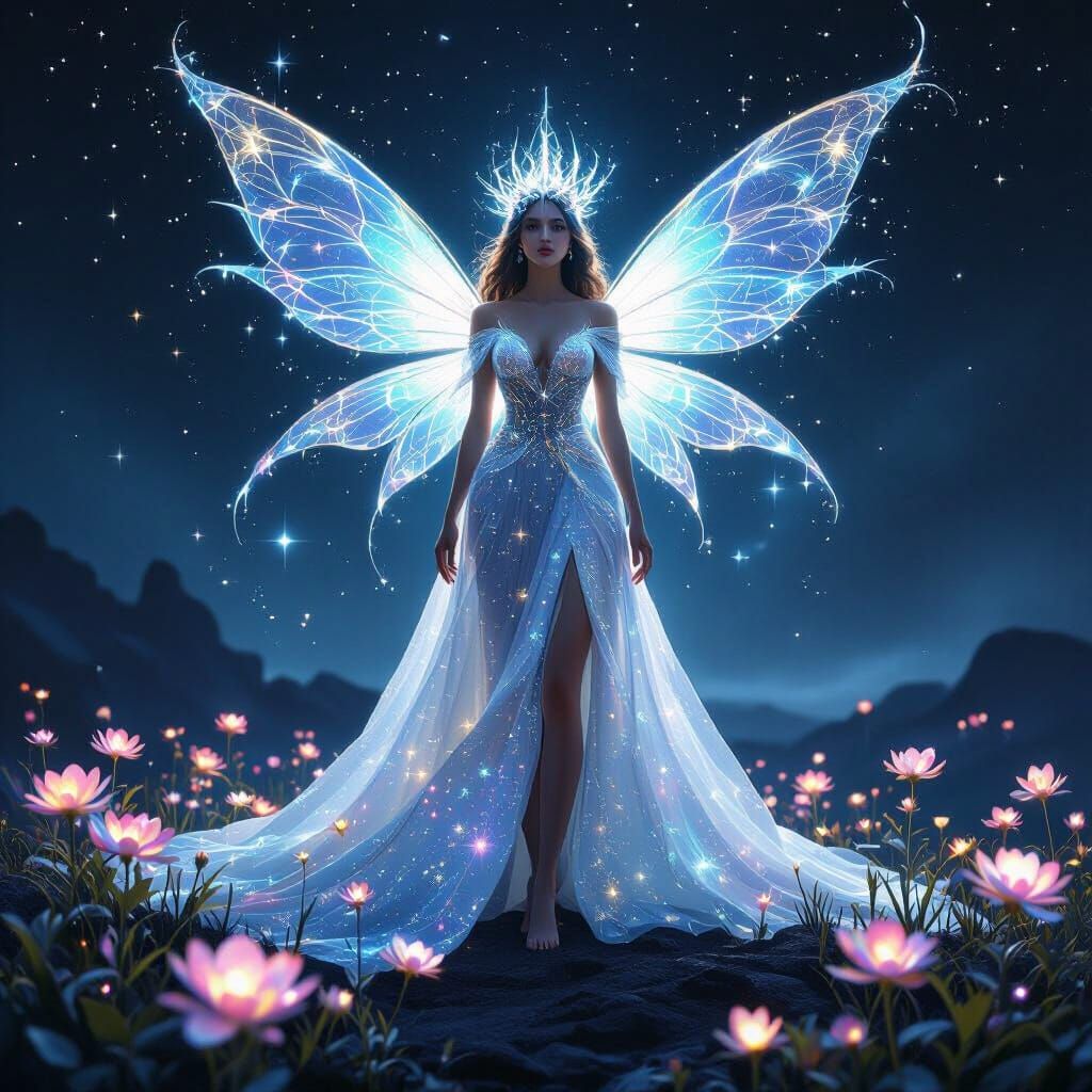 This image shows a celestial fairy queen standing on a rogue planet among iridescent energy flowers. She wears a gown of stardust and has wings of crystalline structures, rendered with cinematic lighting.