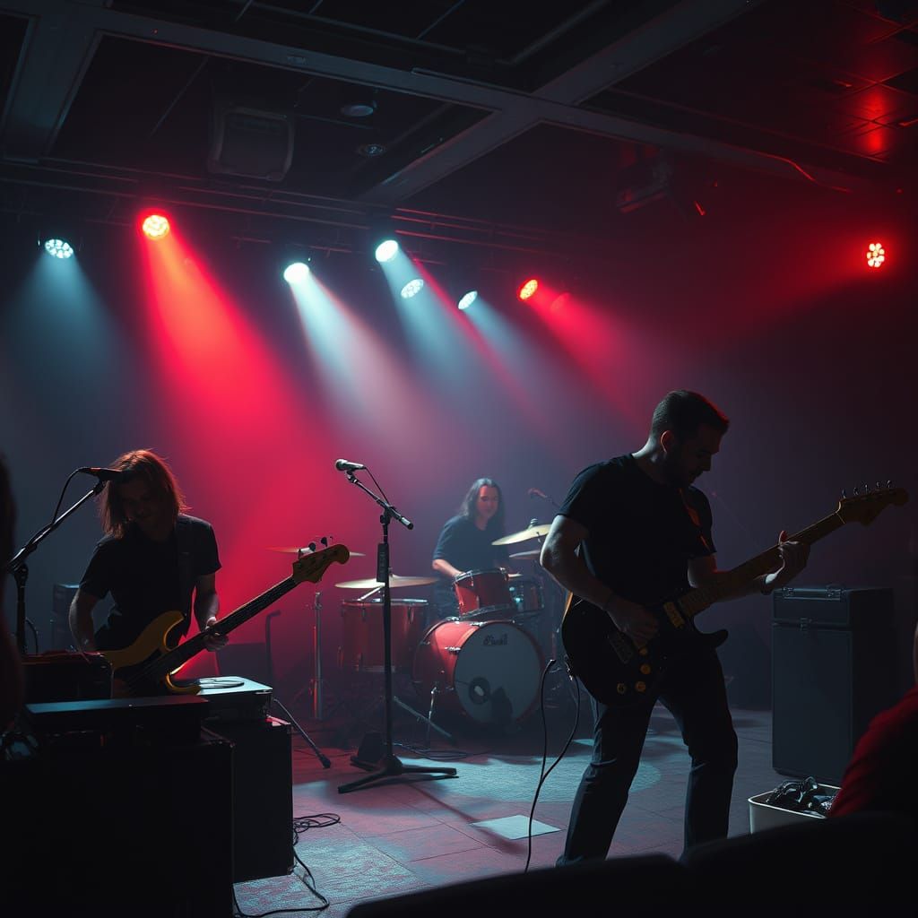 A dimly lit concert venue featuring electric guitars and drums. The scene has a moody, atmospheric glow with neon accents, reminiscent of futuristic digital art.