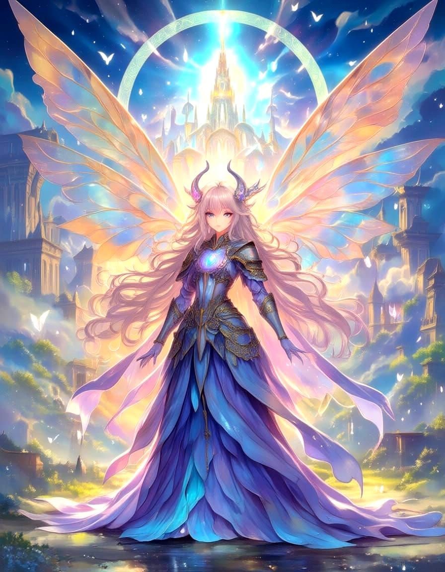 This image depicts a beautiful fairy knight in amethyst armor, set against an ancient, magical city with an ethereal aura. Rendered in a vibrant anime watercolor and ink style with striking line art and vivid colors.