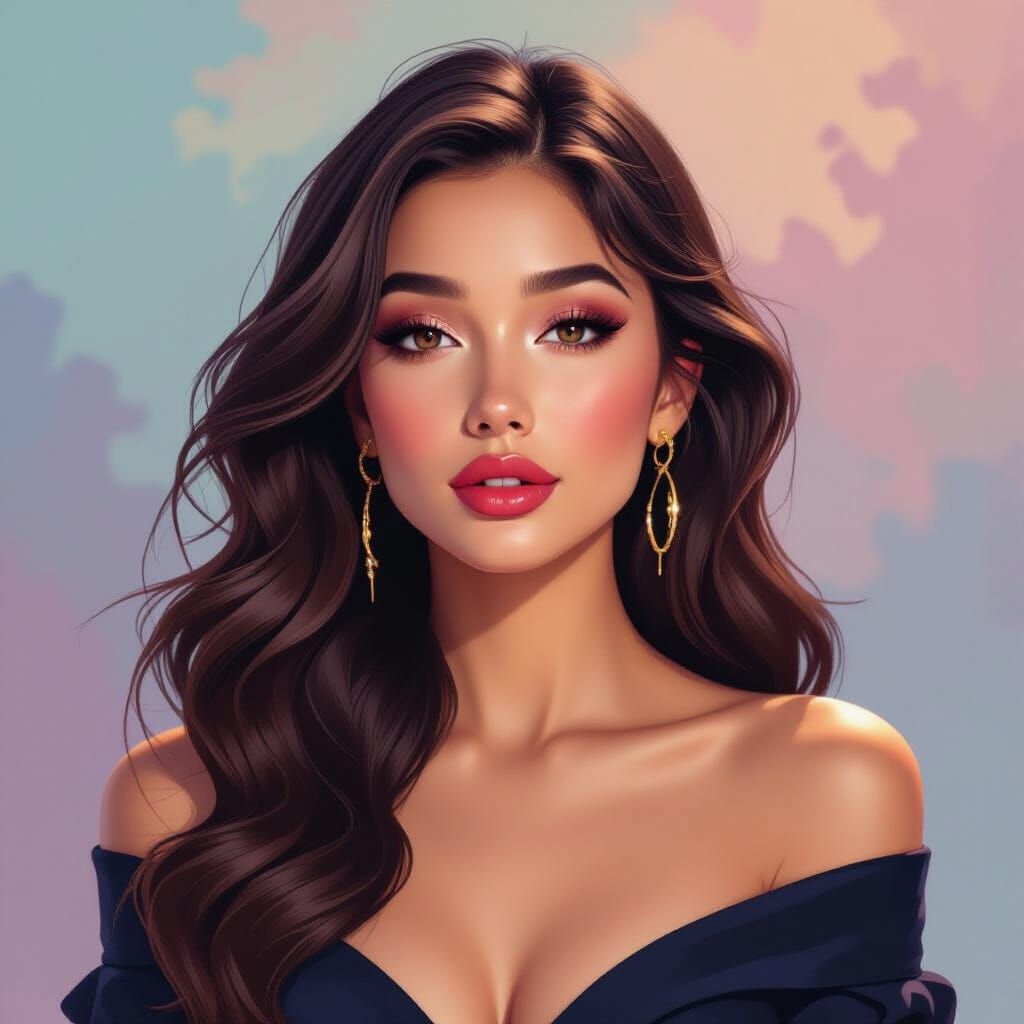 A striking portrait of a young woman with long, flowing hair. The image captures a hyperrealistic aesthetic with vibrant colors, dynamic lines, and lush textures in a digital painting style.