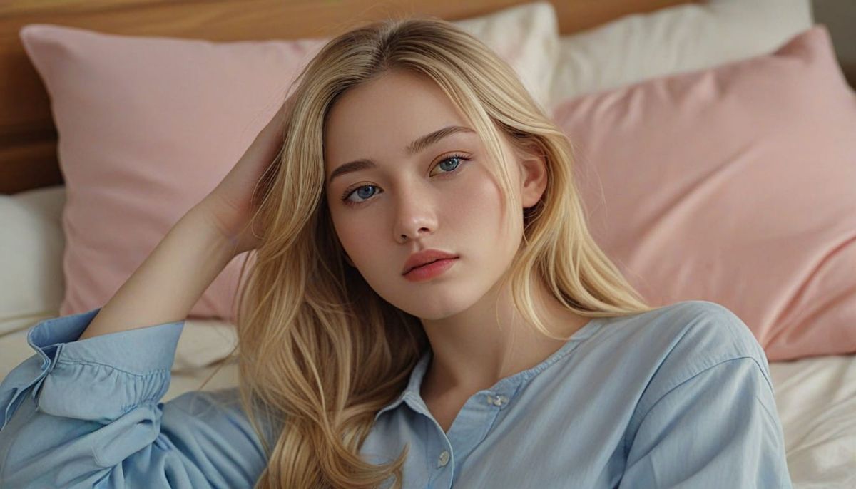 A hyper-realistic digital artwork portrays a young Taiwanese woman with blonde hair and blue eyes reclining on a bed. This close-up, medium shot features soft brushstrokes and pastel colors, reminiscent of French impressionism.