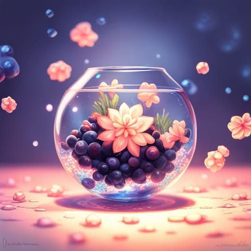 A digital illustration shows glass-like blueberry flowers surrounded by luminous crystal sparkles. The image features vibrant colors, volumetric lighting and depth of field in a hyperdetailed digital art style.