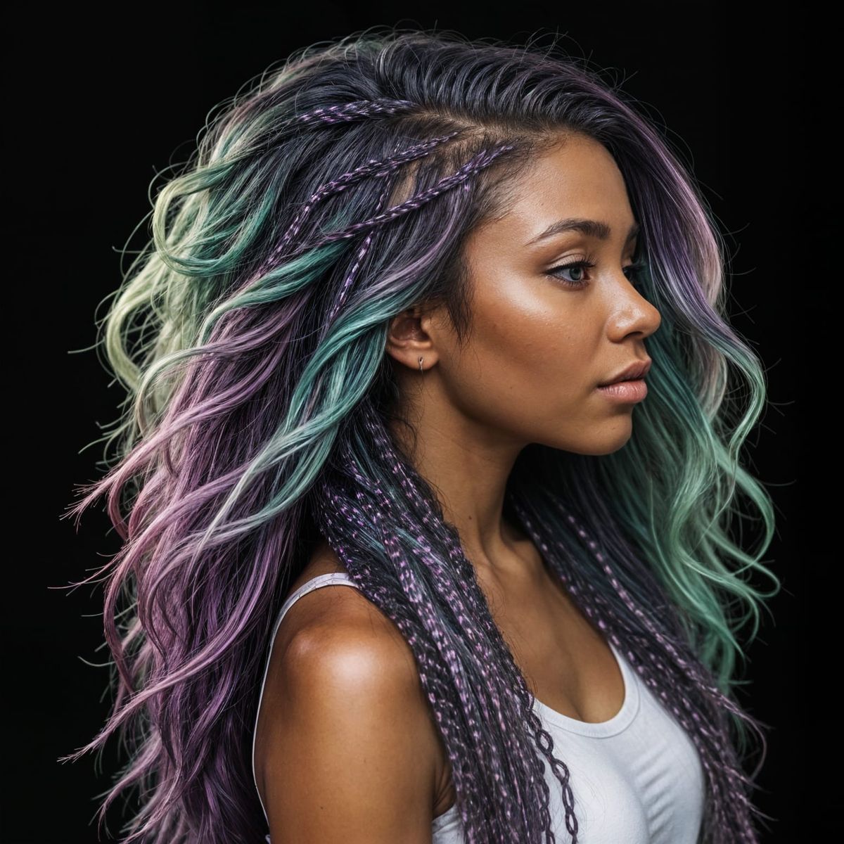 This image showcases a stunning woman with a striking profile, surrounded by a mesmerizing display of colorful lights that blend seamlessly into her long, braided hair.