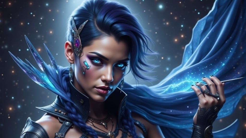 A radiant couple stands on a crystalline asteroid within the Lyrion Nebula, surrounded by a kaleidoscope of colors and billions of stars, their ethereal attire shimmering with an otherworldly glow