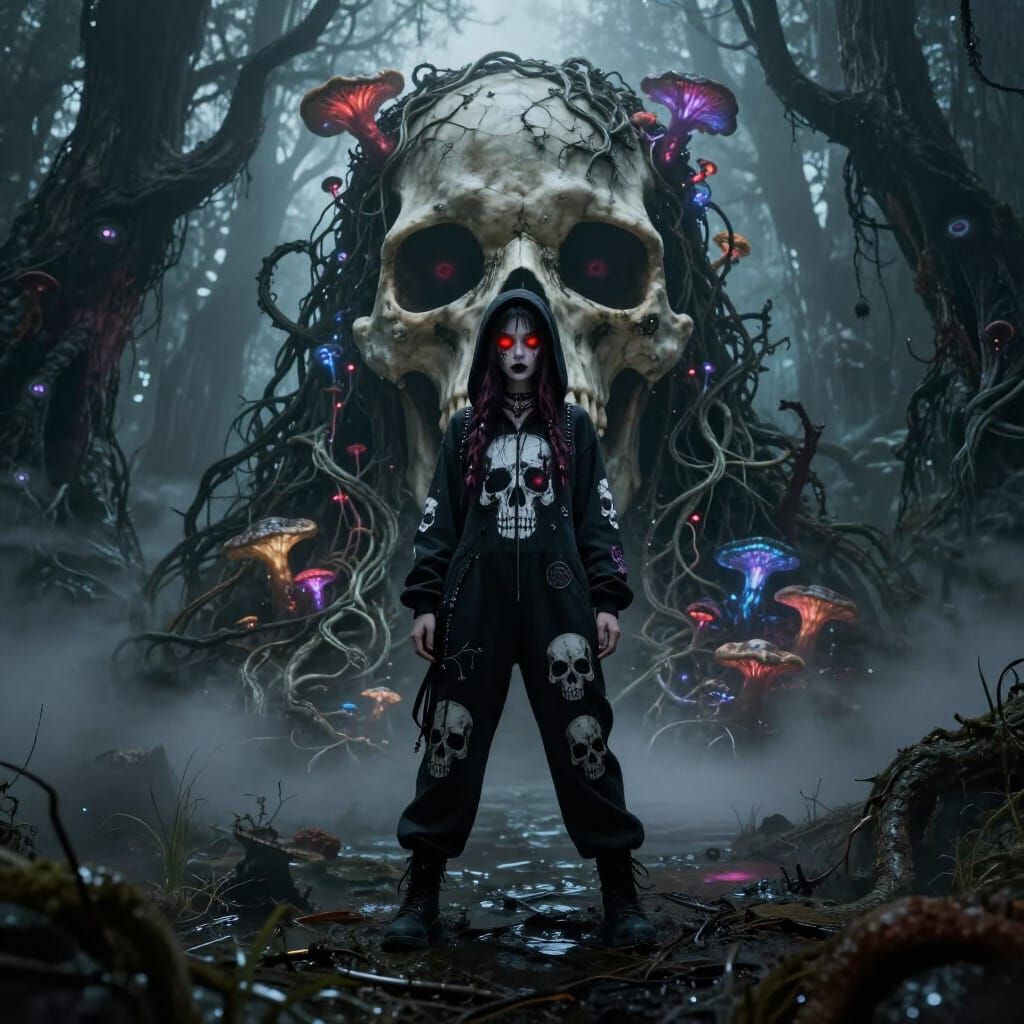 Young lady in hooded onesie deathcore fashion adorned with skull dtf prints, intricate overdone goth makeup, striking accessories, glowing neon red eyes, Infront of A colossal, ancient monster skull, overgrown with bioluminescent fungi and entwined with spectral vines, rests half-submerged in a misty, ...