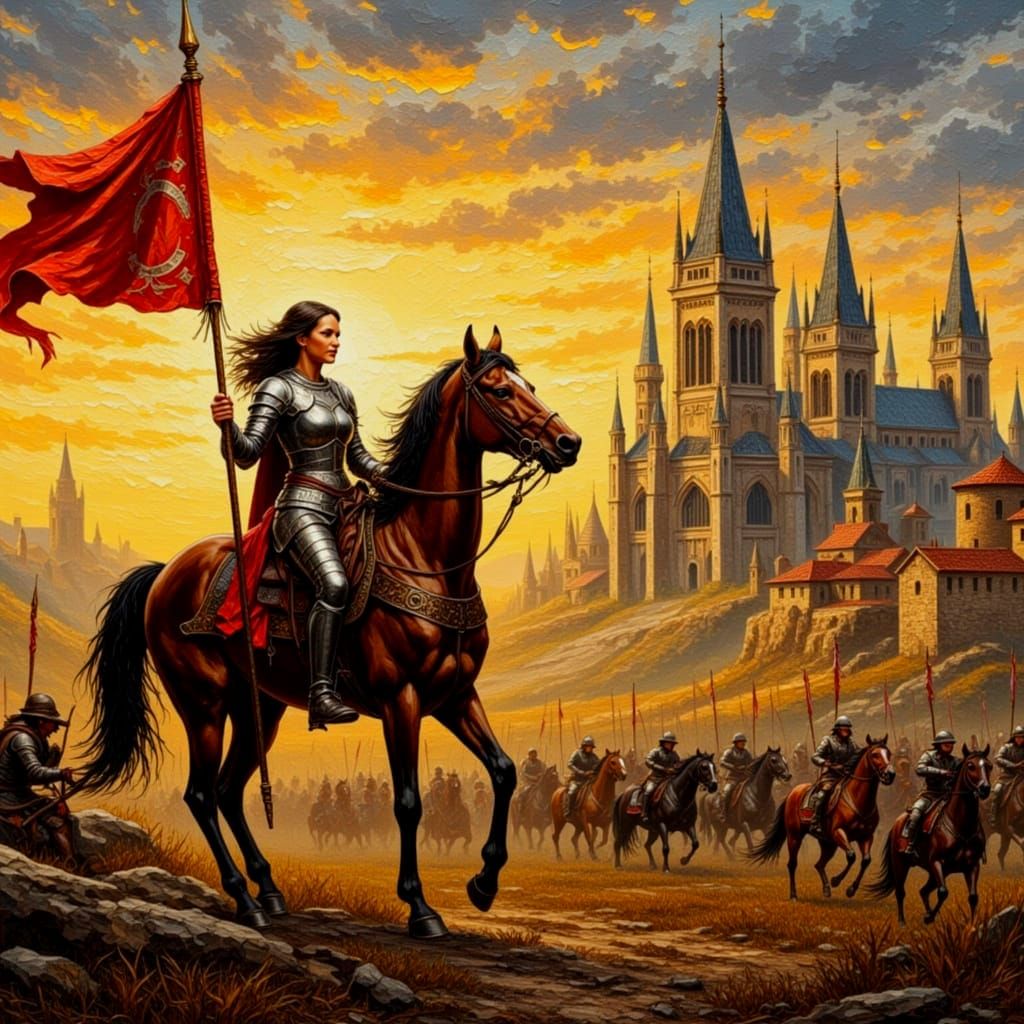 This dramatic scene captures a moment of epic courage at sunset. The central figure is a female knight dressed in shining silver armor, riding a magnificent brown warhorse. She is shown in profile, holding a large red banner aloft, its fabric whipping in the wind, symbolizing her leadership and resolve. The background is dominated by a majestic, sprawling Gothic castle with multiple towering spires, bathed in the rich, fiery light of a golden-orange sunset. A vast army of mounted and foot soldiers is seen marching behind her, suggesting a pivotal moment before or after a major campaign. The overall style is reminiscent of classical historical or fantasy oil painting, full of movement, texture, and high drama.