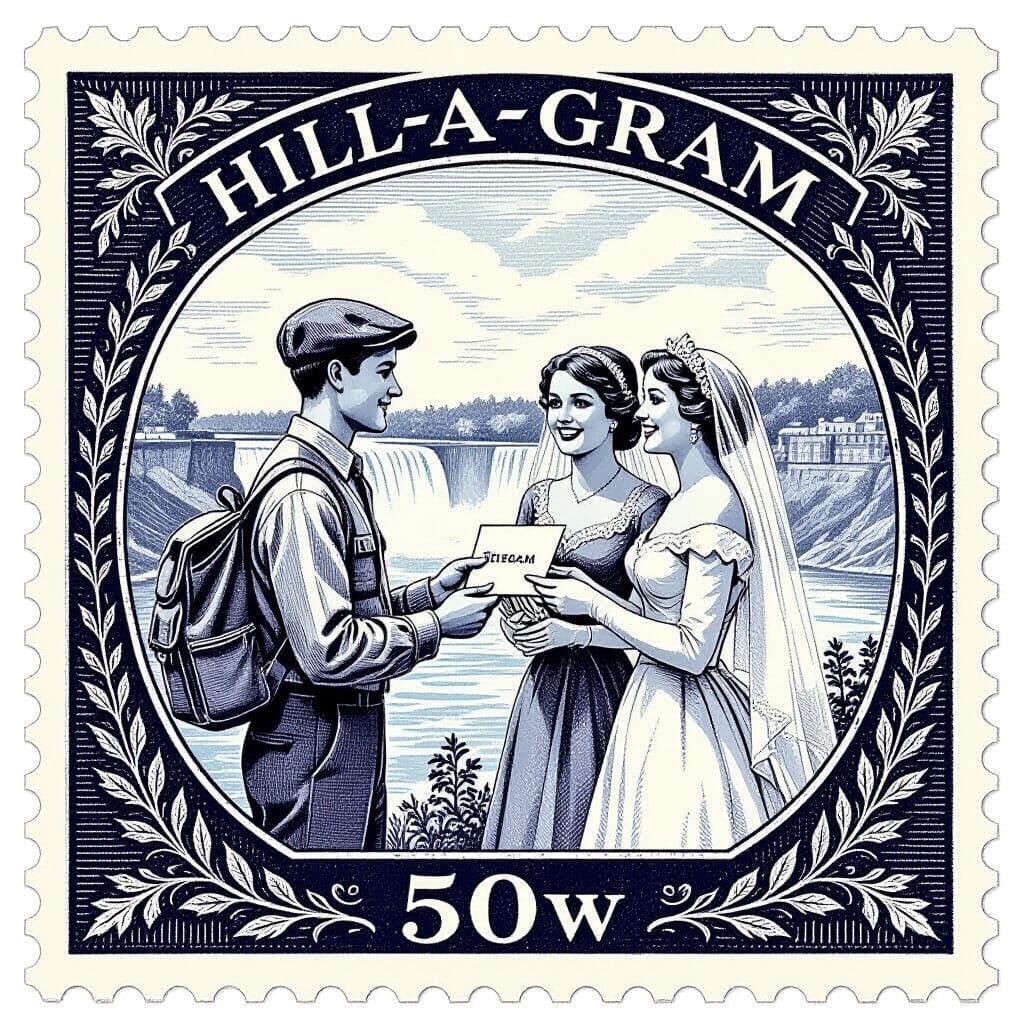 This image is a vintage postage stamp in an engraved etching style, depicting a telegram delivery to a smiling bride and maid of honor with Niagara Falls in the background.
