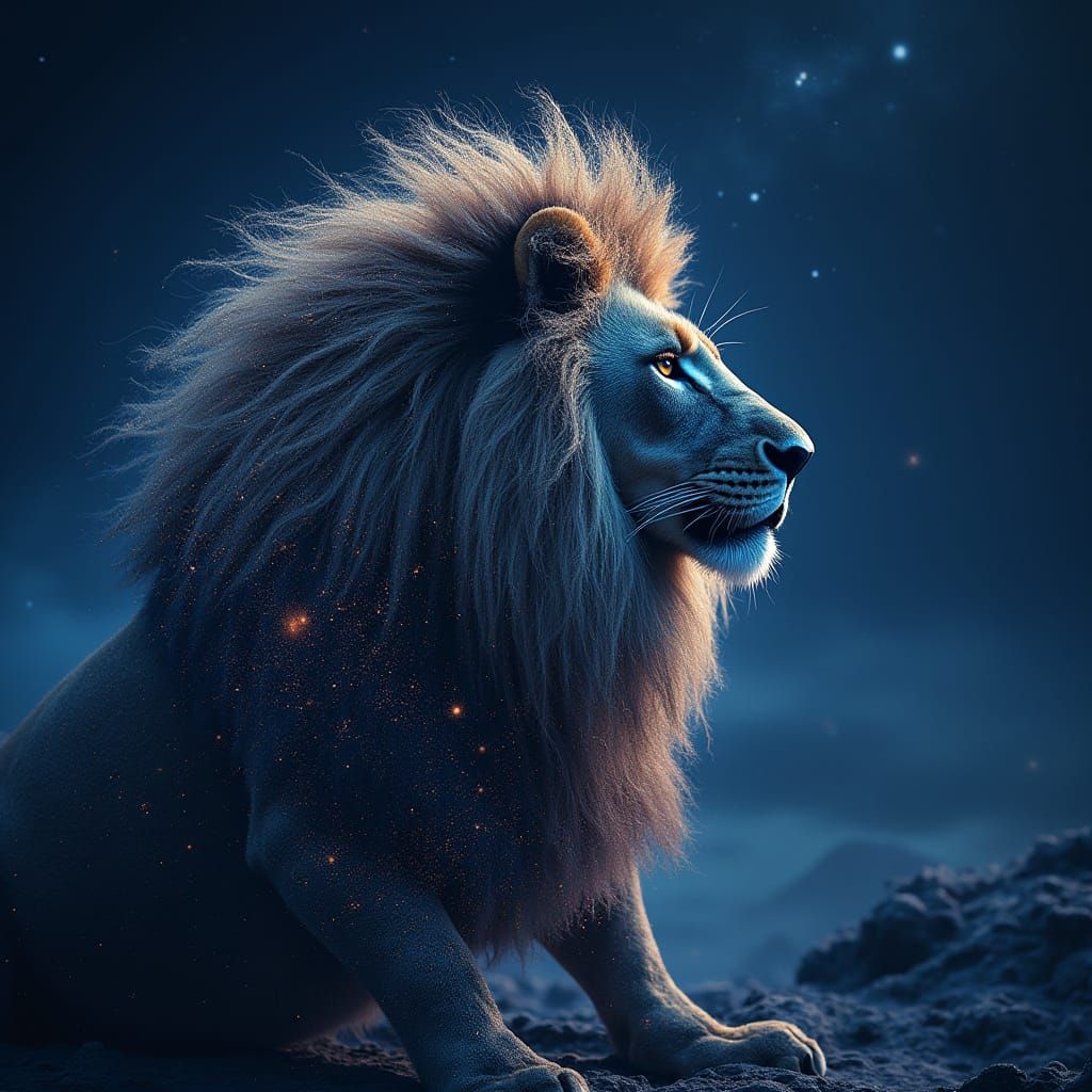 A majestic lion shines with a coat of twinkling stars, set against a deep blue night sky with nebulae, evoking a sense of cosmic wonder and mysticism.