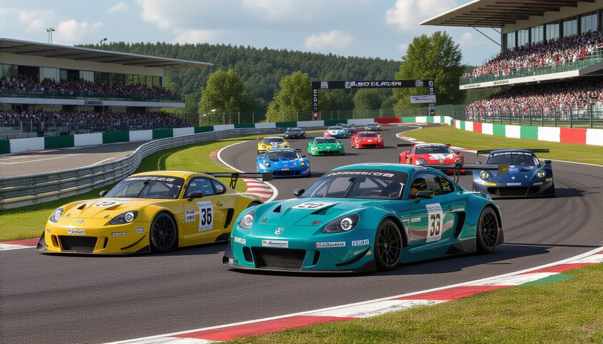 This image shows a vintage sports car race featuring Volkswagen Karmann Ghias redesigned as retro-modern race cars. It's a dynamic scene with a cinematic feel, rendered in a detailed and dramatic style.