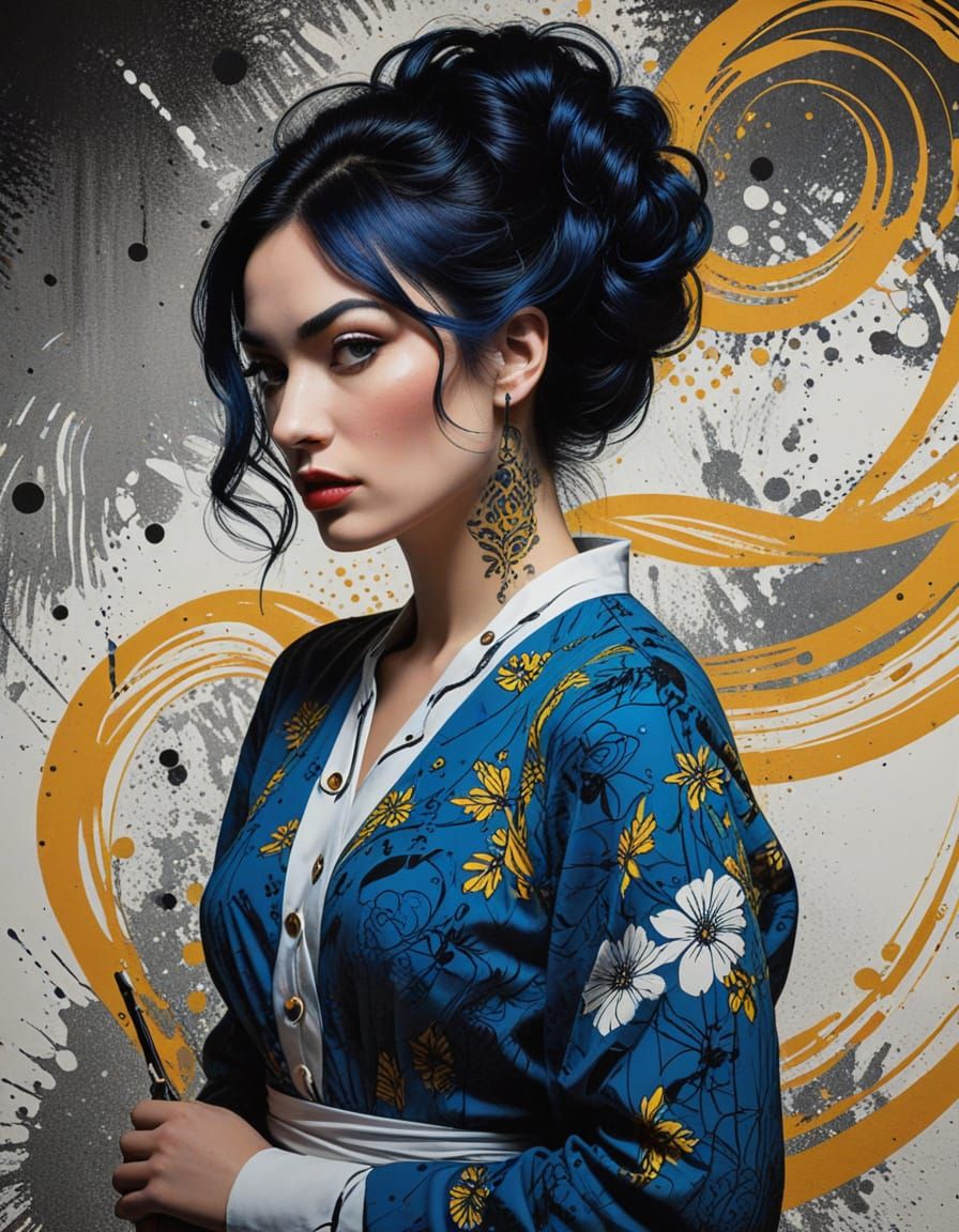 This striking portrait features a stunning woman with intricate tattoos, set against a moody backdrop of deep shadows and vibrant, ink-like colors, all in the distinctive risograph aesthetic with halftone patterns and slight imperfections.
