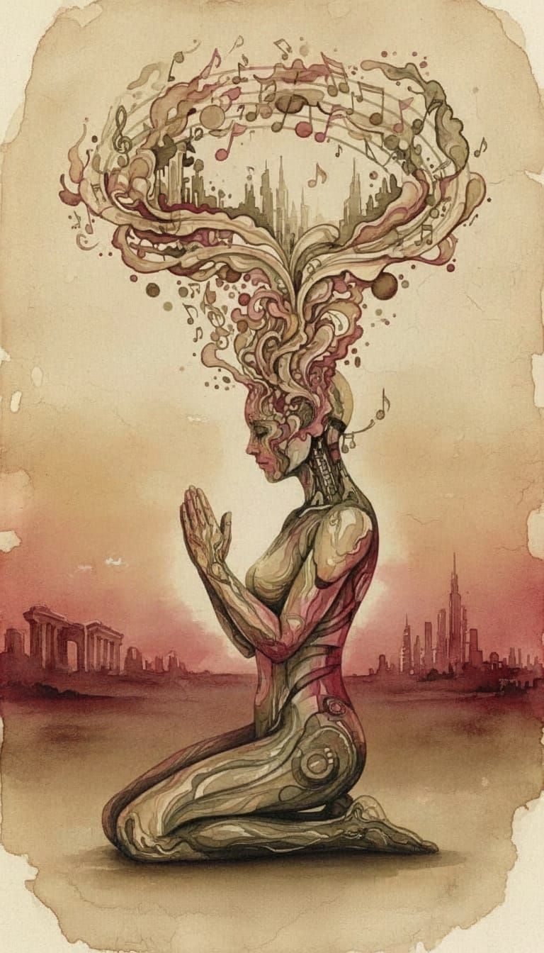 A surreal minimalist monotone painting painted using tea and juice stains of A SOLITARY CYBORG KNEELING IN PRAYER, (Double exposure, lost in thoughts of yesterday, thinking about tomorrow, LIQUID MUSIC EXPLOSION AMIDST RISING CRESCENDO OF OPERATIC WORKS,, at sunset , on cracked parchment