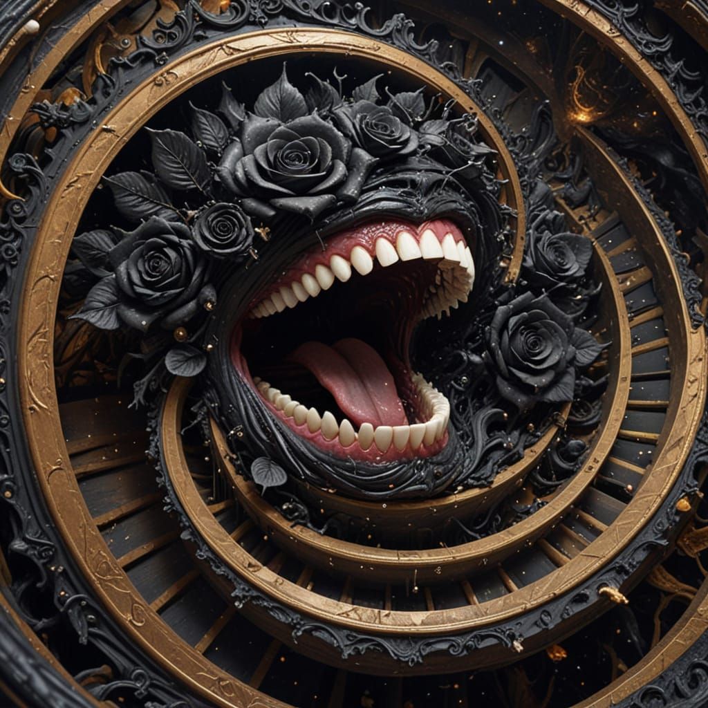 This image is a surreal 3D impasto painting of black roses on a staircase, surrounded by a vortex of math formulas and a giant, screaming mouth with a universe inside. The scene is set in a dark, blooming woods atmosphere, with a sense of urgency and foreboding.