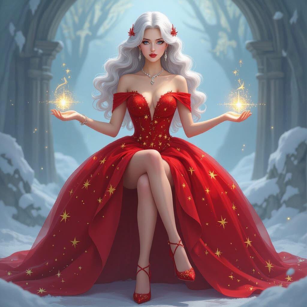 A beautiful ethereal shaman with flowing red and silver hair, seated gracefully in a shimmering red gown adorned with stars. Rendered with soft, cinematic lighting in a Pre-Raphaelite art style.