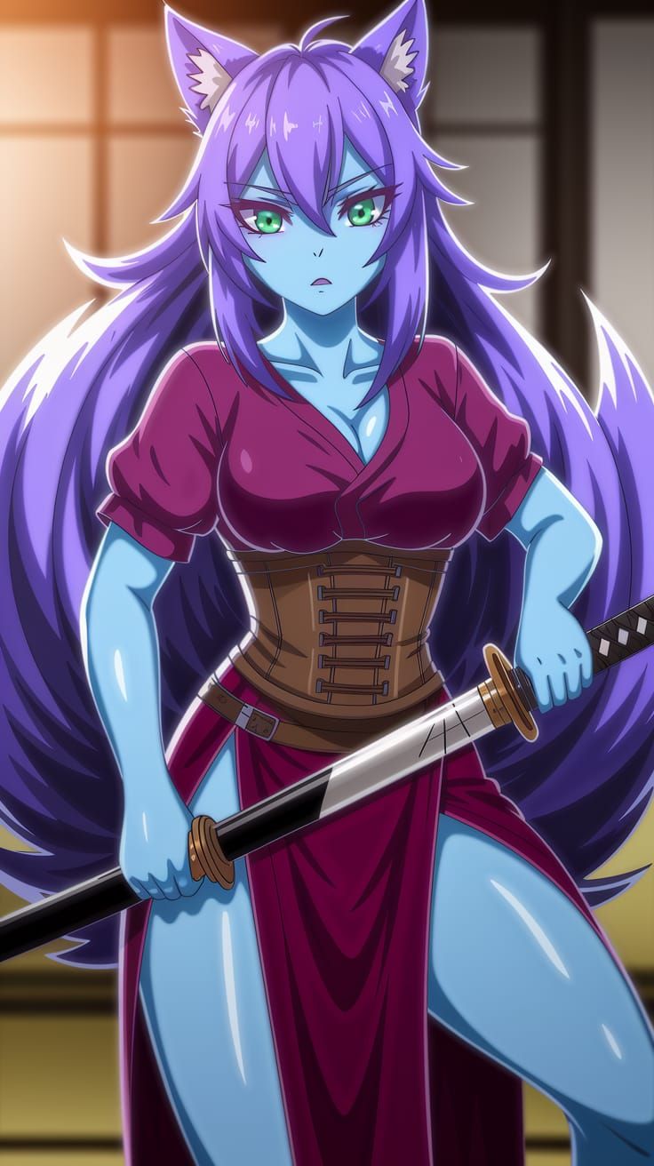 This image shows a powerful kitsune with delicate yet strong features, pale blue skin, and emerald eyes, set against a blurred traditional Japanese landscape. Soft lighting highlights her hourglass figure, and she wields a gleaming katana with determination.