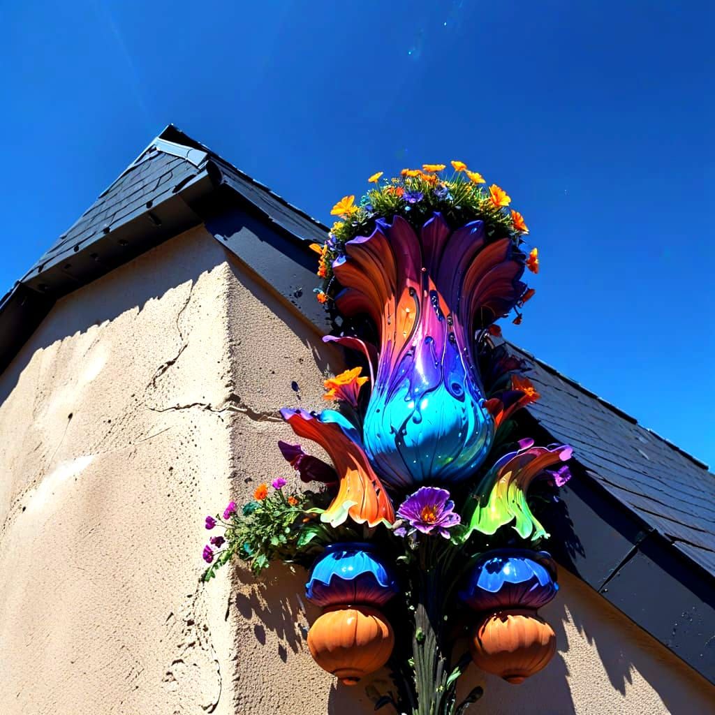 “3D Ominous Action Painting Vanishing portals quantum flowers in flower pots sculptures shimmer with shifting forms, perspective altering p...