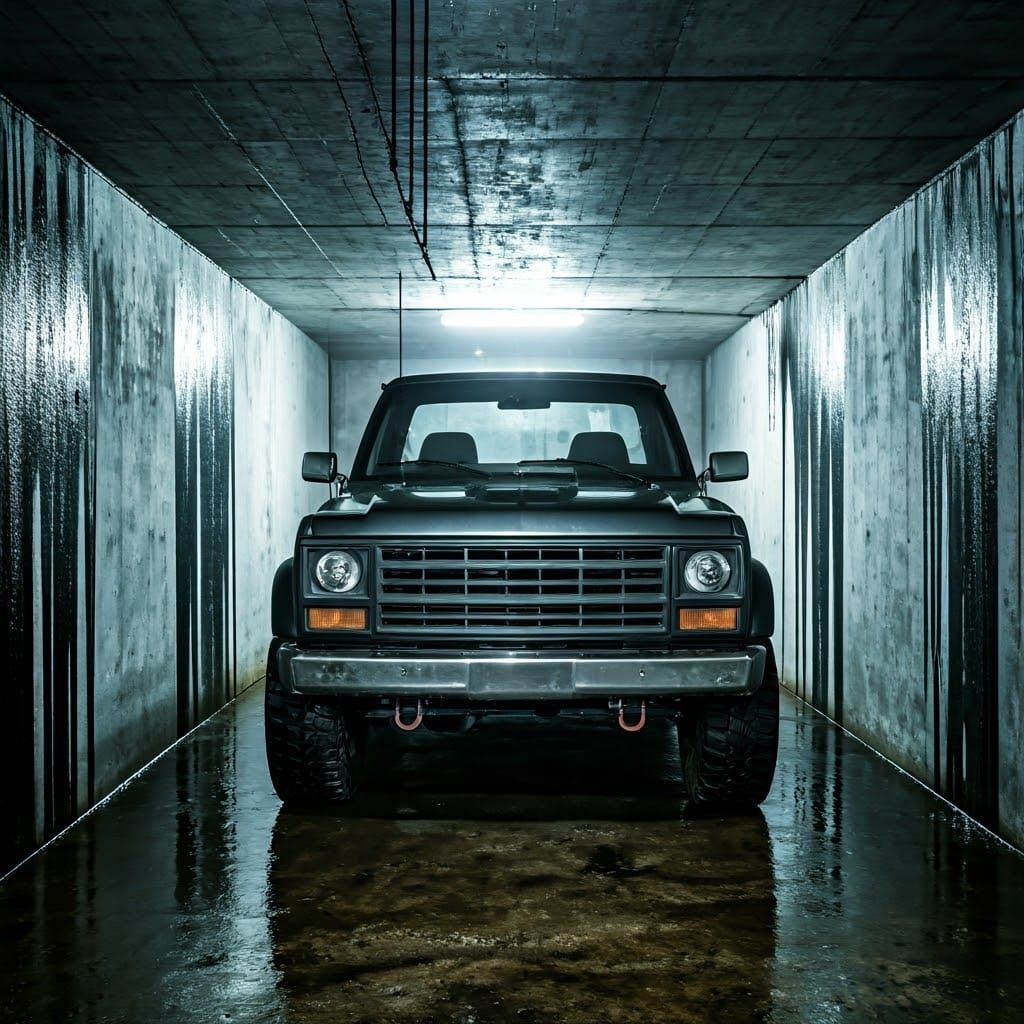 This image shows a menacing pickup truck in a dimly lit, eerie basement setting, with oil leaks and dripping ceilings adding to the ominous atmosphere, captured in sharp focus with professional photography techniques.