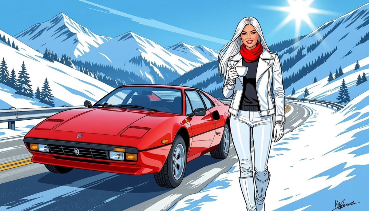 This image shows a woman in white leaning on a red sports car. The scene is a snowy mountain highway, rendered as hand-drawn color comic art with a retro splash panel aesthetic.