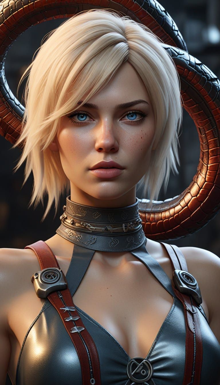This image shows a woman with an eyepatch and metallic snakes in a sci-fi setting. The close-up shot features dramatic lighting, soft skin tones, and intricate details in a 3D game cinematic style.