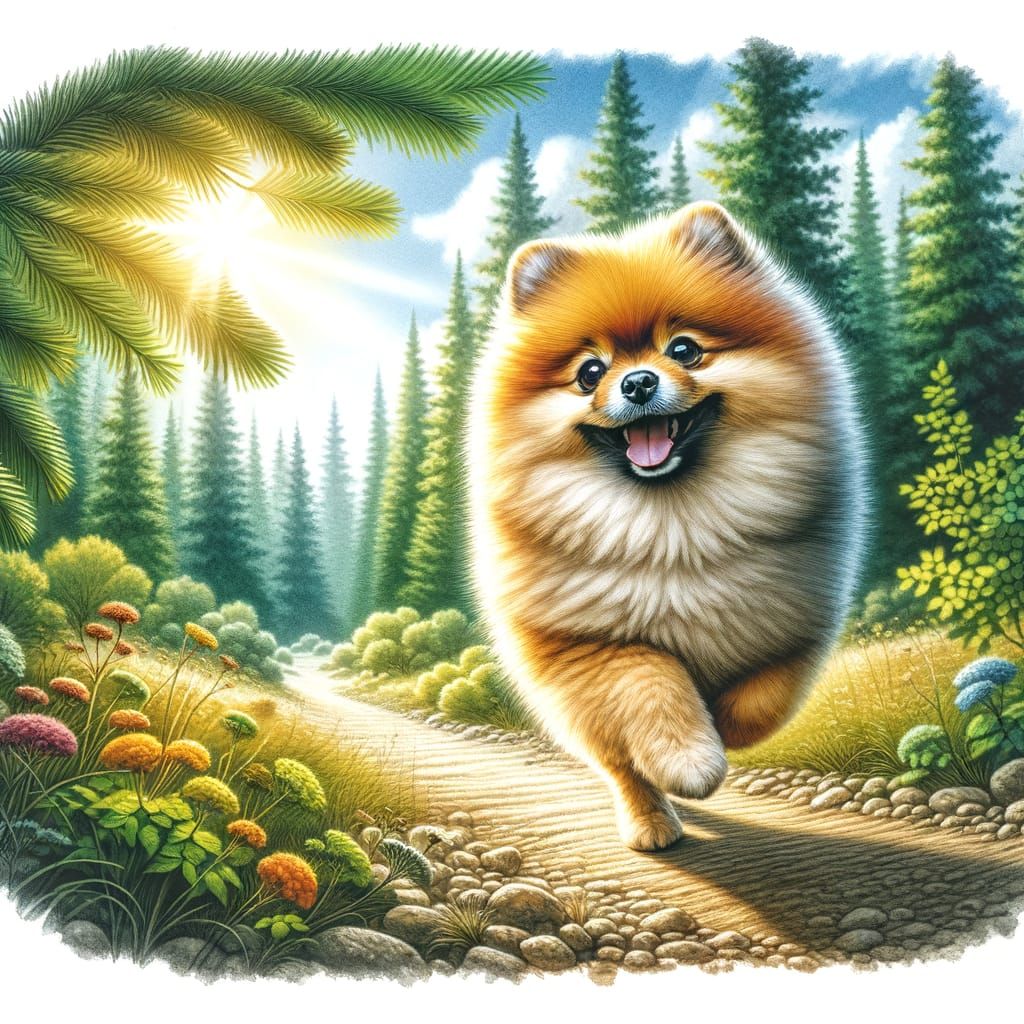 This image shows a happy Pomeranian running through a sunlit pine forest. The watercolor illustration captures the fluffy dog with a snub nose in a hyper-realistic style.