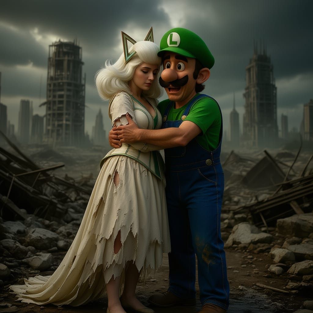 A hyperrealistic cinematic image of the last survivors, Luigi and a white-haired lady, embracing amidst a devastated world. Their expressions convey deep sadness and dwindling hope as they search for the Star Rod.