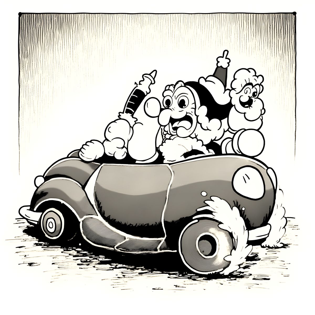 This image shows a whimsical black and white cartoon of a car morphing into a humanoid figure, exuding a jolly atmosphere reminiscent of classic 1930s cartoons.