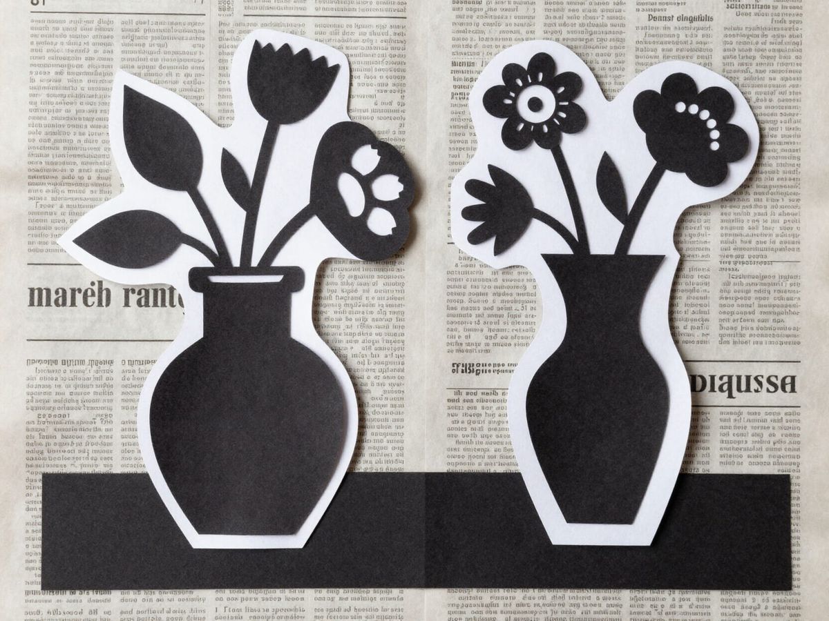 A striking black and white paper collage depicting a cubist still life of two vases with flowers, set against a background of newspaper clippings.