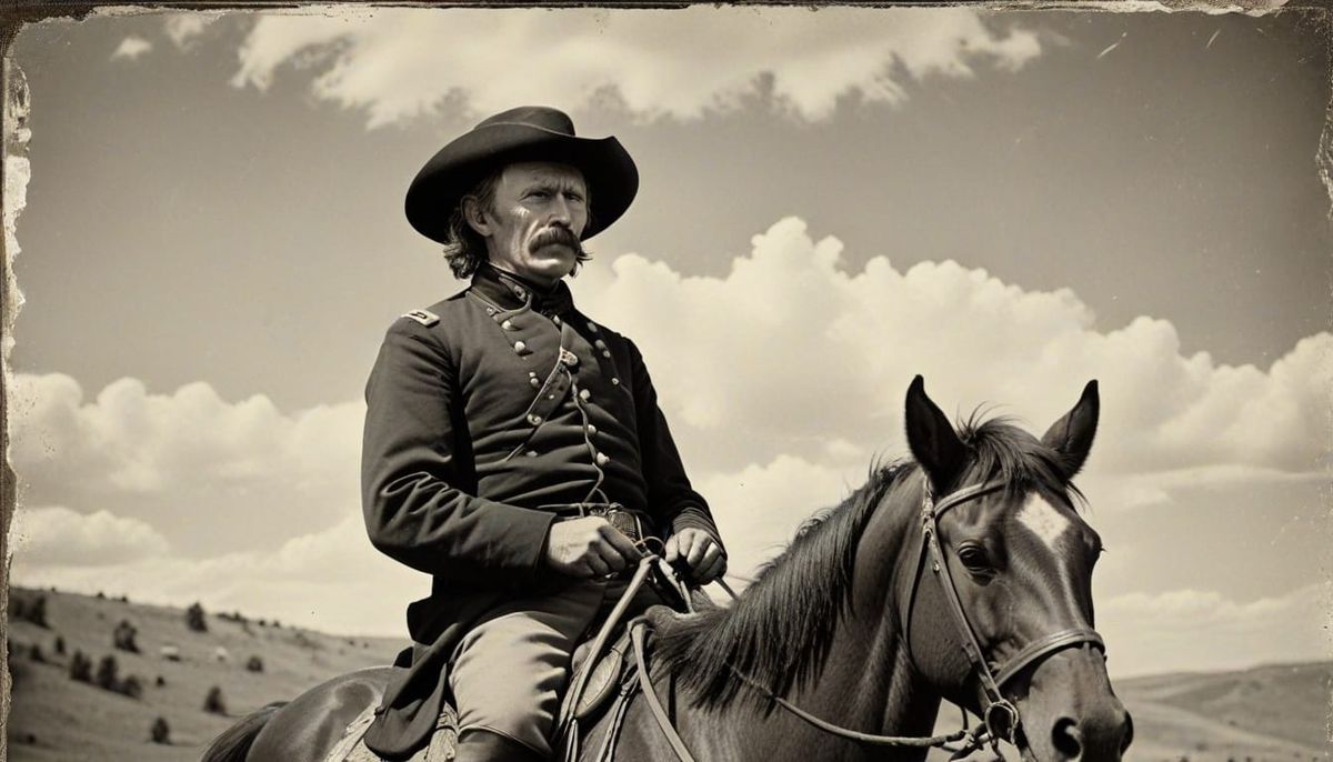 A vintage black and white photograph of General George Armstrong Custer on horseback, set against the historic backdrop of the Battle of Little Big Horn, with a worn and creased texture that evokes a sense of timelessness and dusty aged tones.