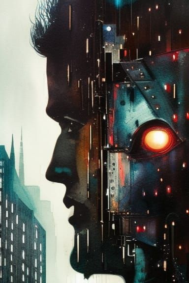 A dramatic portrait of a dark superhero set against a rainy Chicago cityscape. This gothic art piece uses ink and watercolor to create hyperdetailed, dramatic lighting.