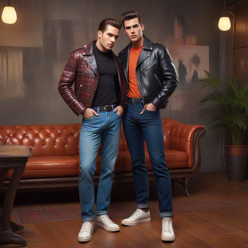 This image shows two men in 1950s attire. One is a greaser in a leather jacket, the other wears a plaid sport coat. The illustration features bold brushstrokes, warm lighting and vibrant colors in a retro matte painting style.