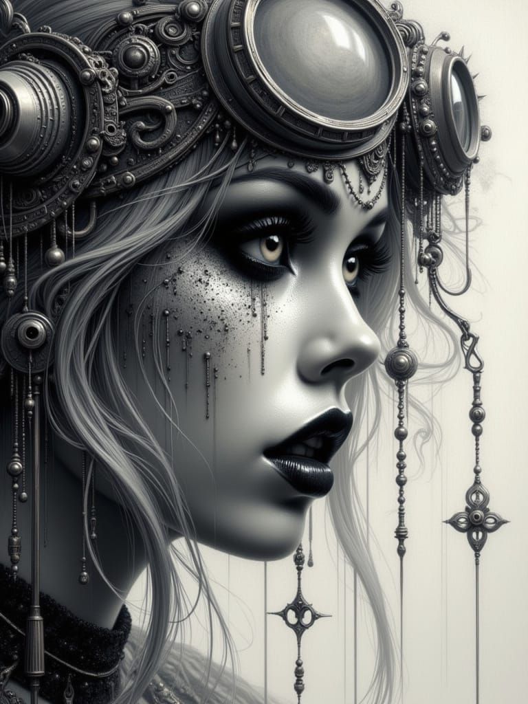 This highly detailed sketch shows a beautiful goth woman on a skateboard mid-air over a concrete jump. The image uses a fisheye lens perspective with pencil lines and smudging.