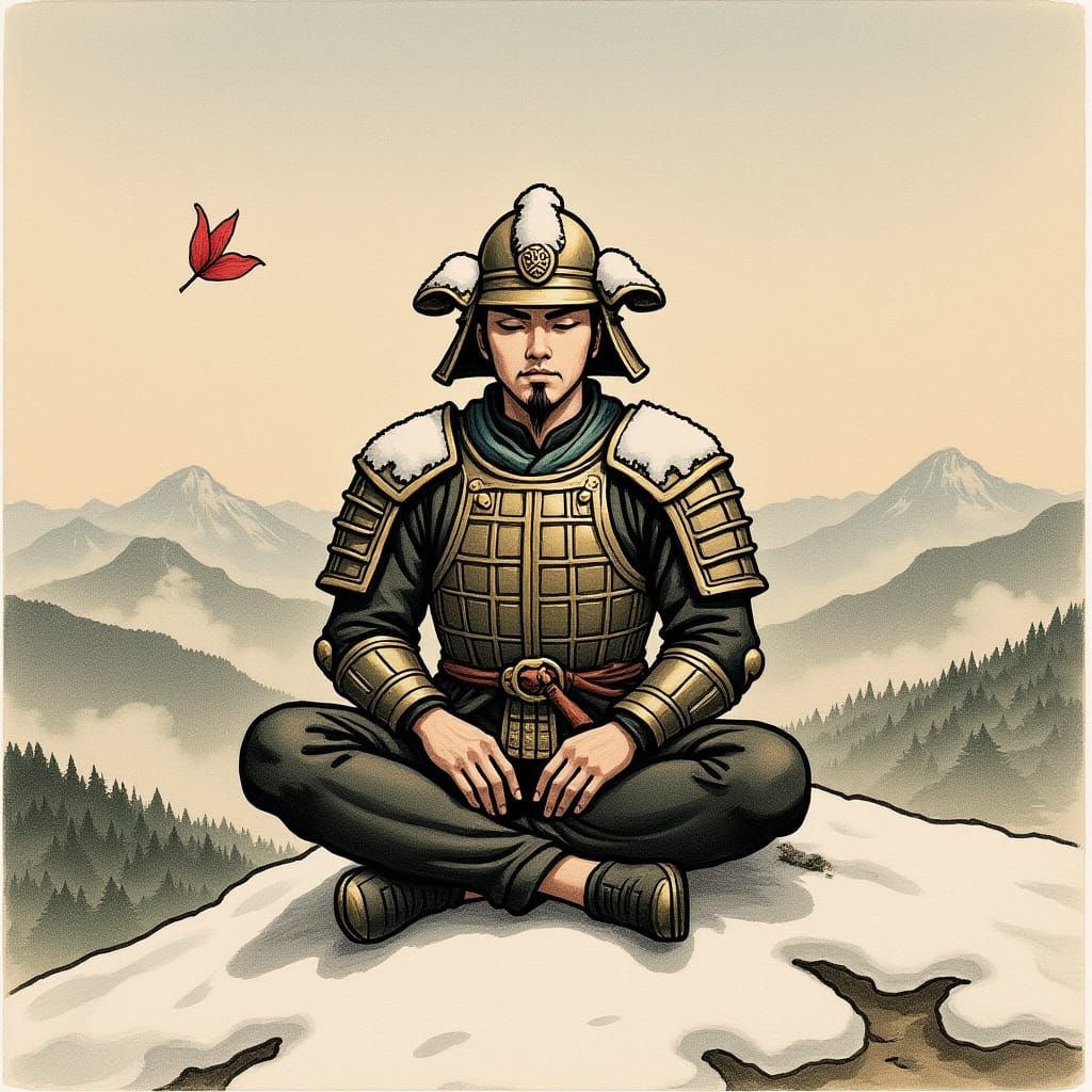 A lone samurai meditates on a snowy mountain, gazing over a misty valley. The artwork blends traditional Japanese ink wash painting with cinematic photography, creating atmospheric depth.