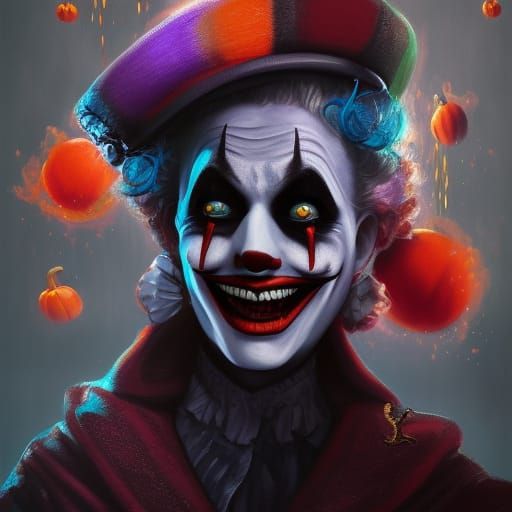 A detailed digital painting of a sinister Halloween clown with bats flying in the background. The artwork features rich colors and intricate details, reminiscent of fantasy concept art.