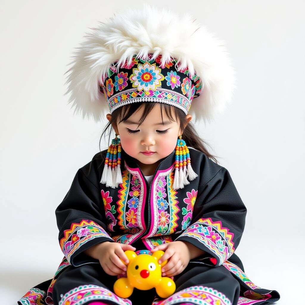 This image shows a child in traditional Hmong clothing playing with a yellow toy. The bright and colorful attire features embroidery and a beaded headdress, set against a white background. The art style features bold lines and textured patterns.