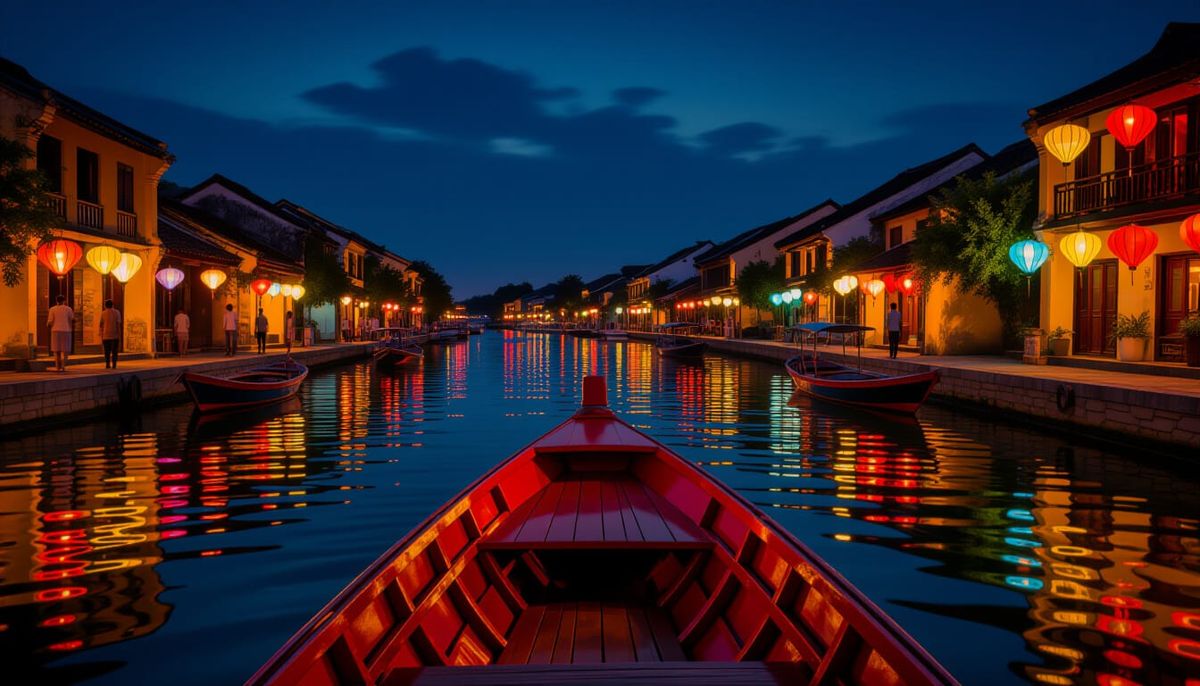 This image shows a small red boat on the Thu Bon River in Hoi An, Vietnam, at night. Silk lanterns illuminate the riverbank, casting colorful reflections on the water, in a photorealistic style.