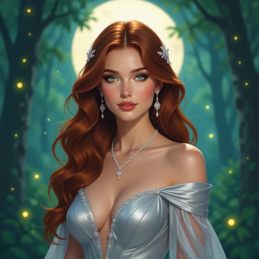 This image shows a beautiful woman with auburn hair in a moonlit forest. The woman wears an elegant gown and diamond ornaments, rendered with vibrant colors in an art nouveau style.