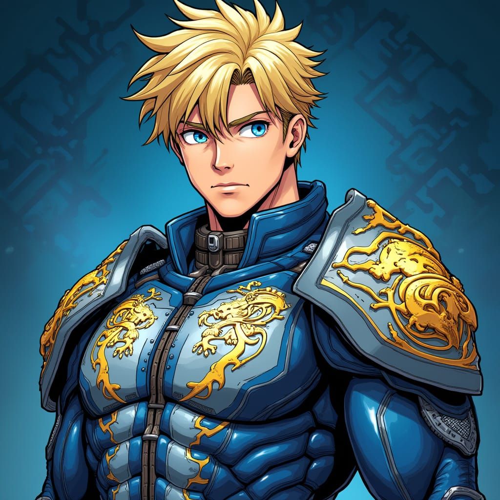 This image depicts a muscular male sci-fi warrior with a bold, high-energy design, set against a deep blue gradient background with intricate golden dragon patterns on his futuristic harness, evoking the styles of Anime Key Visuals and Japanese Manga.