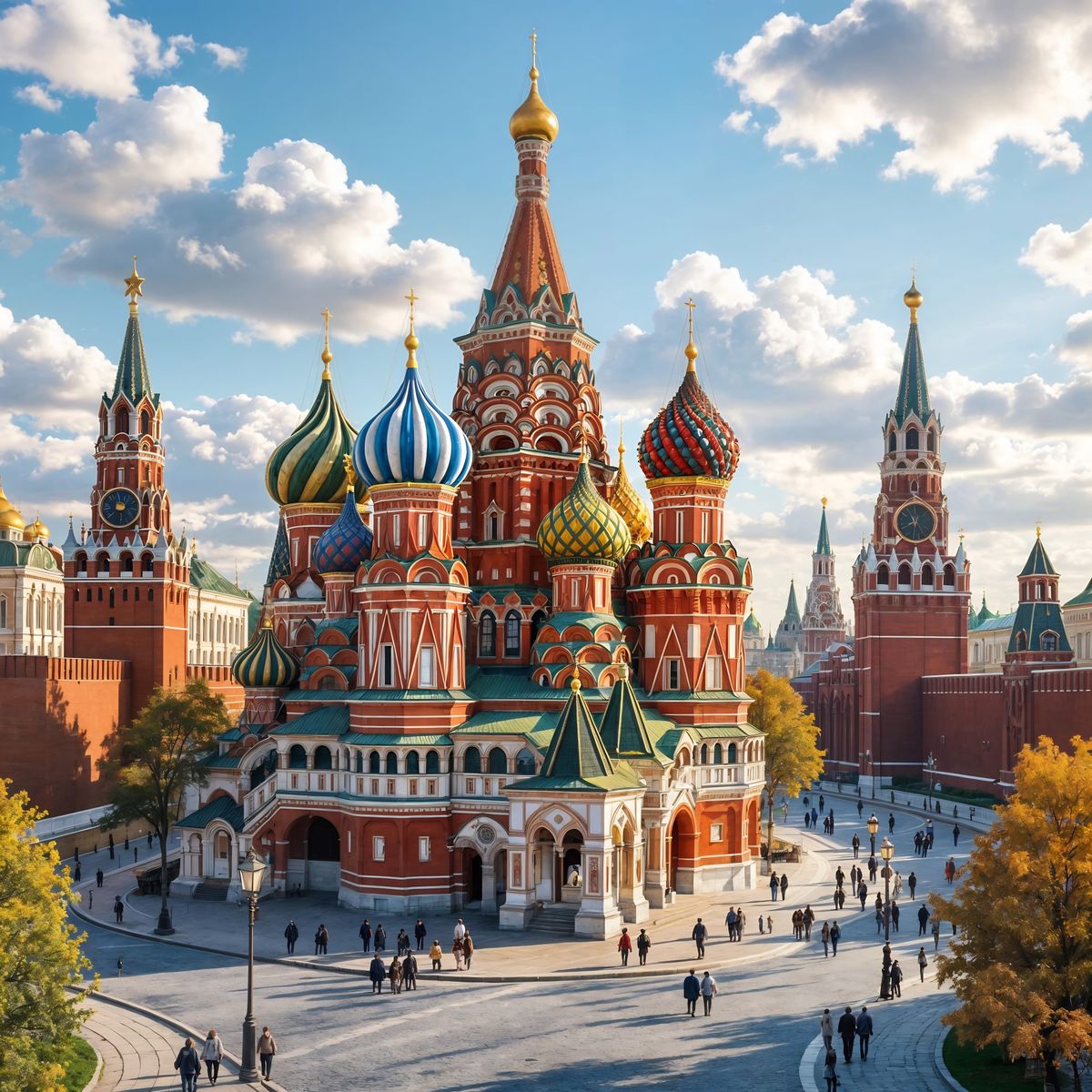This image showcases Saint Basil's Cathedral on a bright autumn day, featuring intricate architectural details of the cathedral, Red Square, and Kremlin. Rendered as a digital matte painting with deep, vibrant colors.