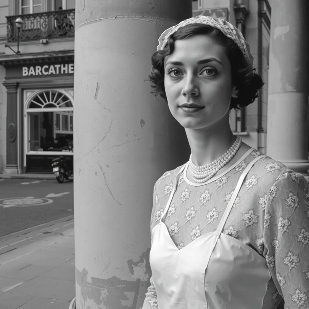 A striking portrait of a young woman in 1920s attire against a muted cityscape. The image blends stylized realism with vibrant colors and dramatic lighting, reminiscent of art deco portraiture.