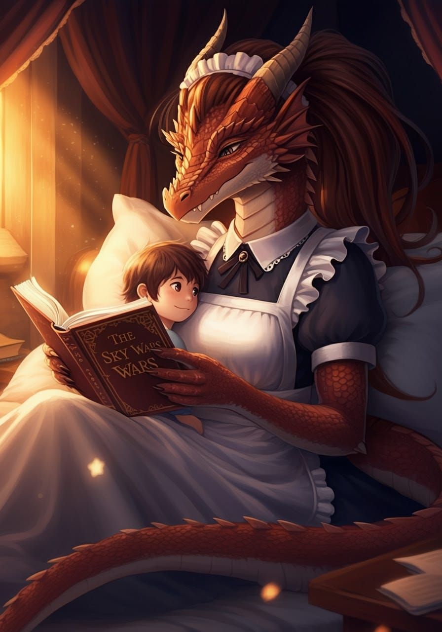 This high fantasy illustration depicts an anthropomorphic dragon in a maid outfit reading to a young boy in a castle bedchamber. Cinematic lighting and a tranquil atmosphere enhance the scene.