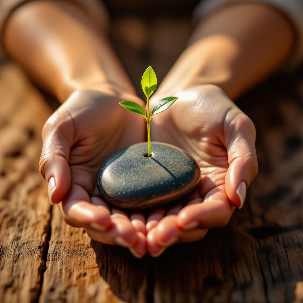 This image shows two hands holding a dark river stone. A glowing green sprout emerges from the stone, illuminated by warm morning light. Cinematic macro photography with soft bokeh.