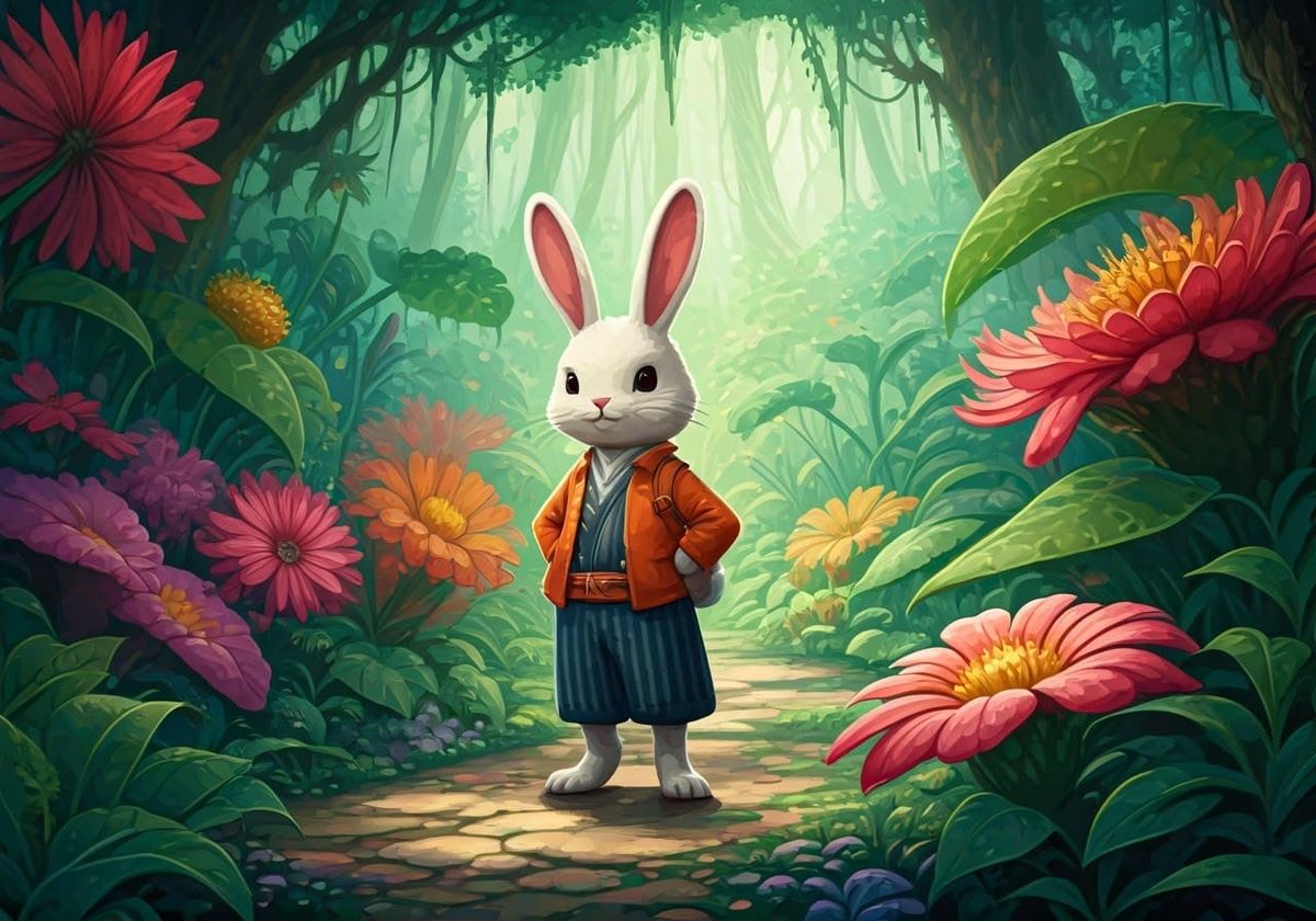 A whimsical image shows rabbit-like characters in a fantastical forest filled with oversized plants. The digital painting blends Japanese folk art with modern techniques and watercolor softness.